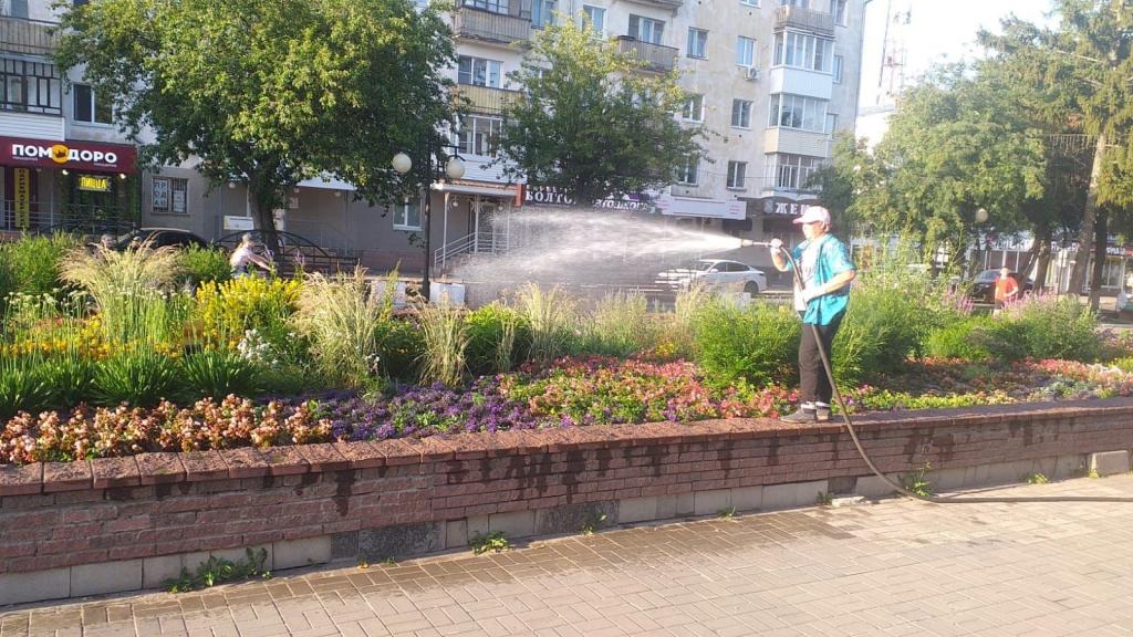 В эти жаркие дни они проводят водные процедуры на цветниках и остановочных павильонах. Растениям, как никогда, нужен полив, чтобы не погибнуть, а остановки промывают от пыли и грязи.