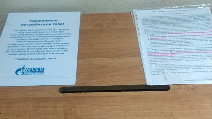 Для Вашего удобства в г. Йошкар-Оле, п. Медведево, с. Семёновка размещены в офисах Управляющих компаний опломбированные ящики для сбора документов (адреса УК указаны ниже). При опломбированных ящиках имеются пустые проекты договоров, памятка по правильному заполнению документов и необходимым действиям для заключения договоров. В типовой форме договора, утверждённой Правительством РФ, предусмотрено разделение работ по техническому обслуживанию и ремонту газового оборудования.