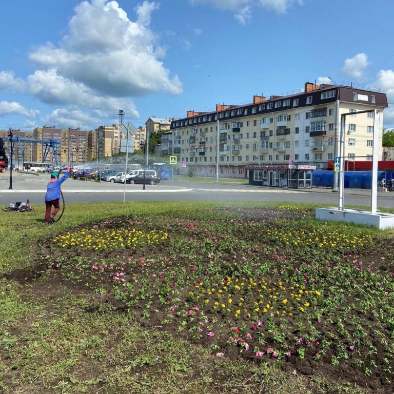 Растения уже появились на цветнике около железнодорожного вокзала. Эта клумба обустраивается второй сезон подряд.