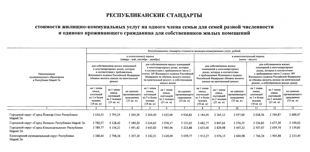 Приводим пример республиканских стандартов стоимости жилищно-коммунальных услуг в городском округе «Город Йошкар-Ола»: