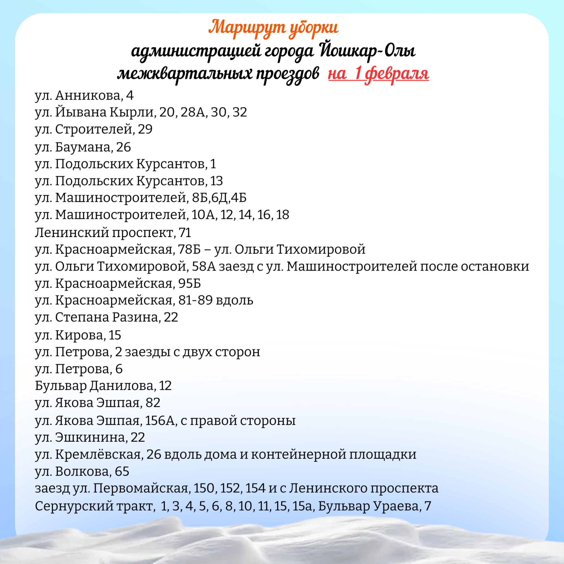 В мэрии Йошкар-Олы сообщили график расчистки межквартальных проездов на 1 февраля.
