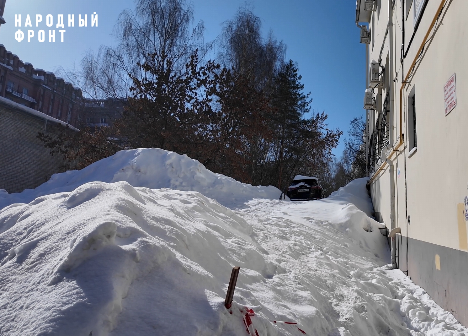- ул. Якова Эшпая, 119 — вместо полноценной очистки кровли, УК просто закрыла проход. Теперь людям приходится пробираться через двор по узкой тропинке,