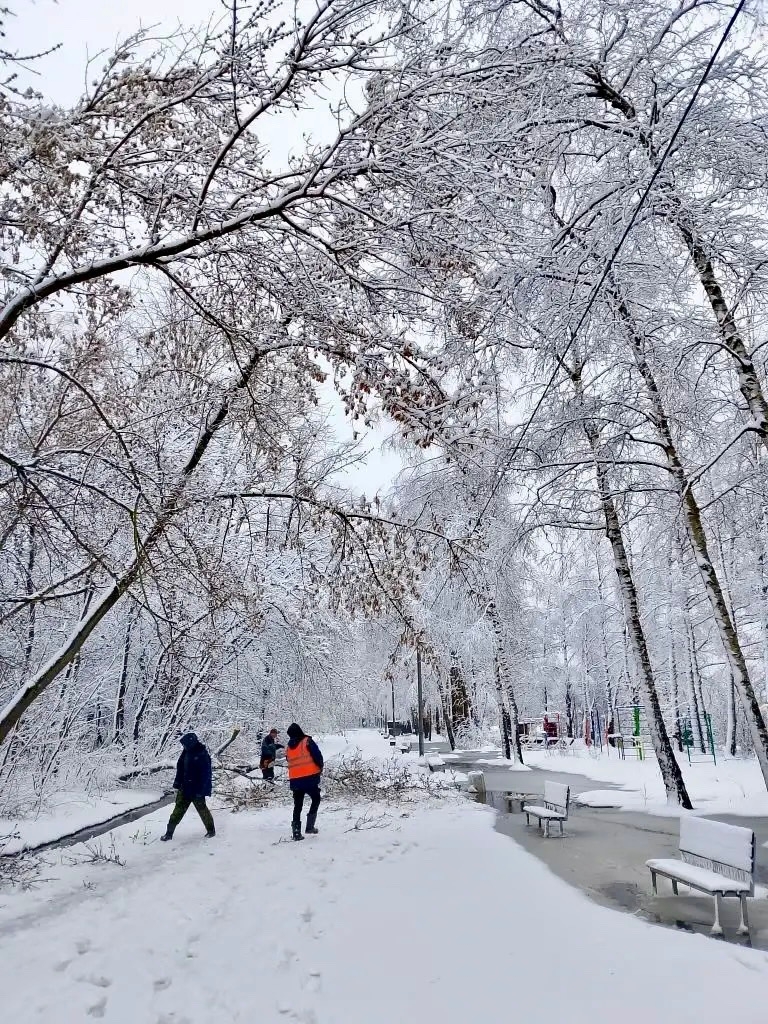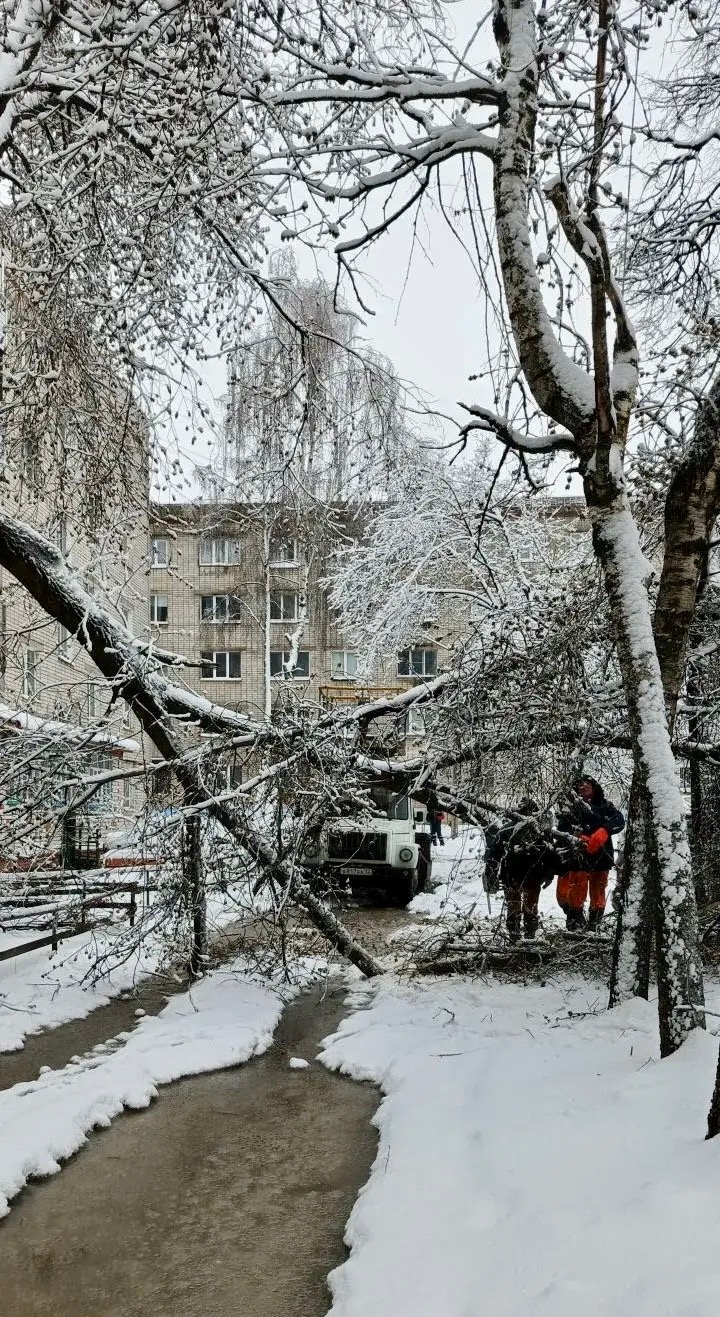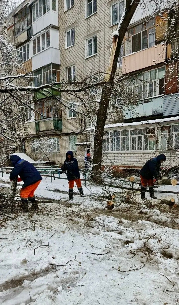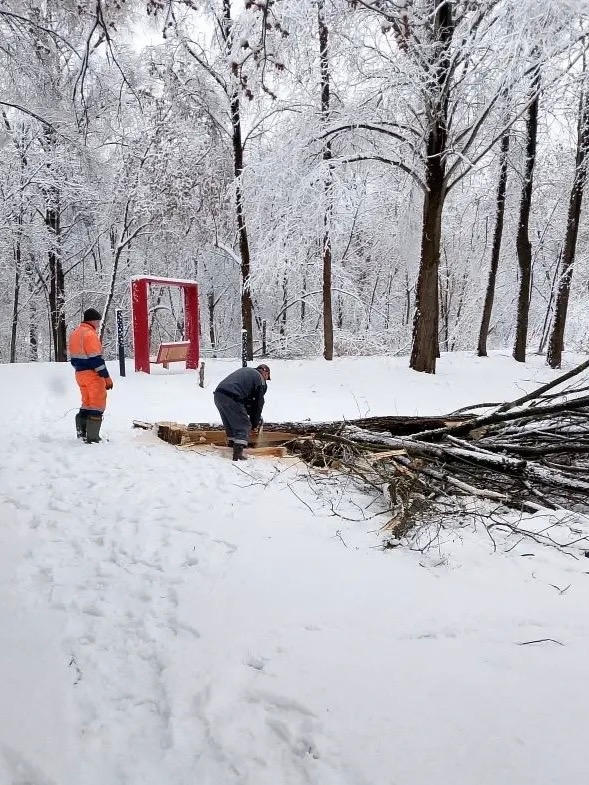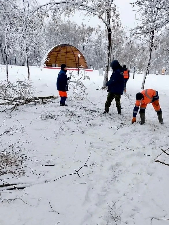 Специалисты восстанавливают электроснабжение, убирают стволы деревьев, обеспечивают проходимость тротуаров и дорог.