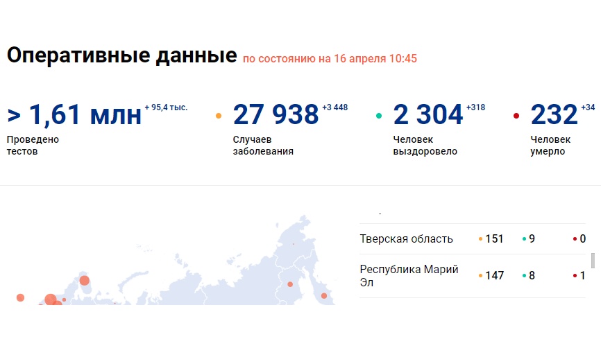 За сутки умерло 34 человека с коронавирусом, за весь период по России — 232.