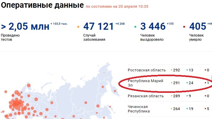 За весь период по России умерло 405 человек, в Марий Эл — 1, сообщает пресс-служба Информационного центра по мониторингу ситуации с коронавирусом.