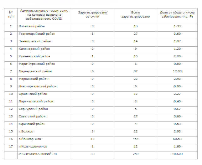 Управление Роспотребнадзора по Марий Эл обновило данные распространения коронавируса по районам республики.