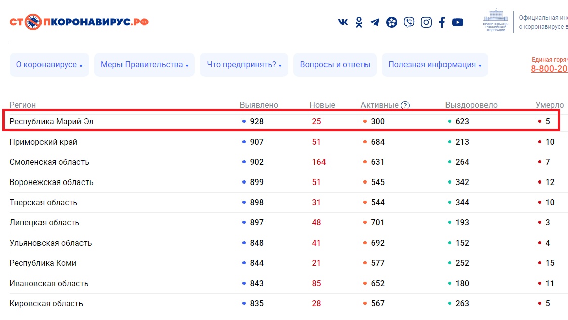 Коронавирус в Марий Эл и не думает стихать. По информации сайта «стопкоронавирус.рф», за сутки в республике подтвердилось еще 25 случаев заражения. С начала пандемии число заболевших в регионе составило 928 человек. По состоянию на 11 мая в Марий Эл 300 больных, 623 выздоровевших и 5 умерших.
