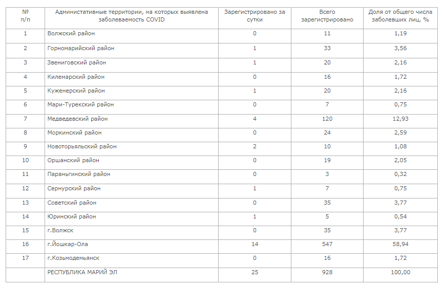 В Марий Эл за сутки зарегистрировано 25 случаев заболевания коронавирусом. По информации Управления Роспотребнадзора по Марий Эл, из них 14 — в Йошкар-Оле, 4 — в Медведевском районе, 2 — в Новоторъяльском районе.