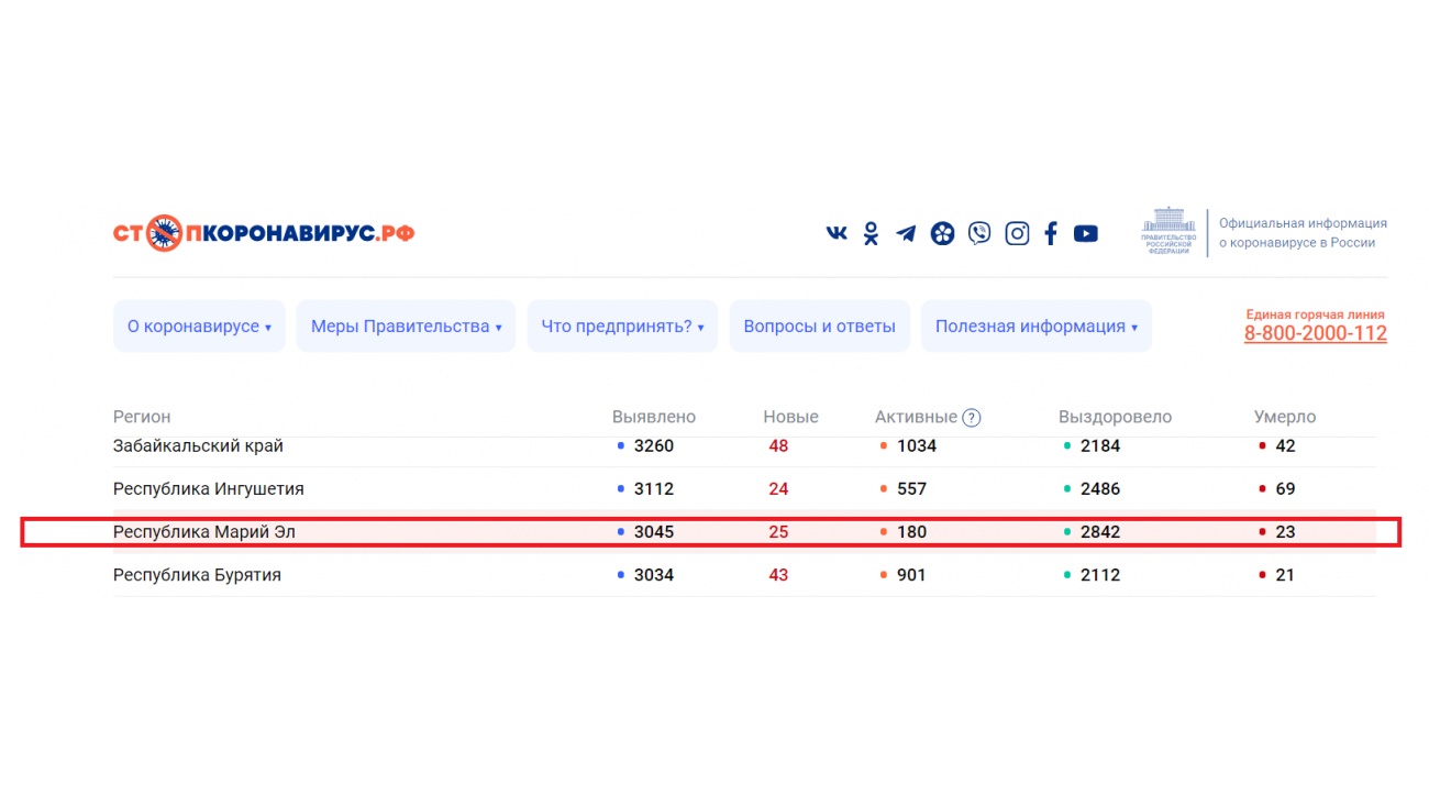 За последние сутки в России официально подтверждено 6 718 случаев новой коронавирусной инфекции в 84 регионах, в том числе в Марий Эл — 25. Общее число инфицированных с начала пандемии в РМЭ составило 3 045 человек.