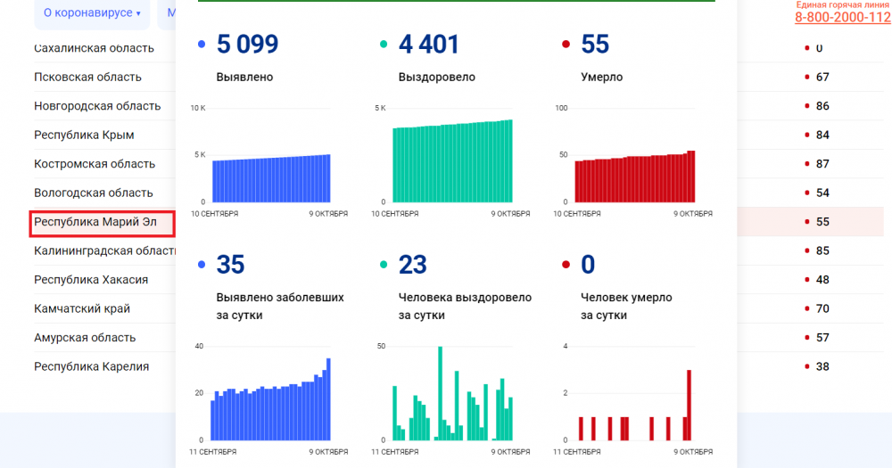 В Марий Эл: за весь период выявлено 5 099 человек, выздоровели — 4 401, умерло — 55, выявлено заболевших за сутки — 35, выздоровело за сутки — 23.