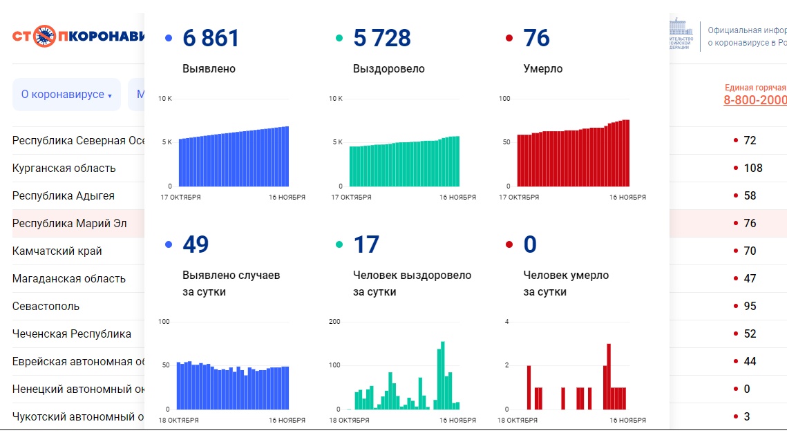 Всего с начала пандемии в Марий Эл заболел 6 861 человек, выздоровело 5 728 человек, умерло — 76.