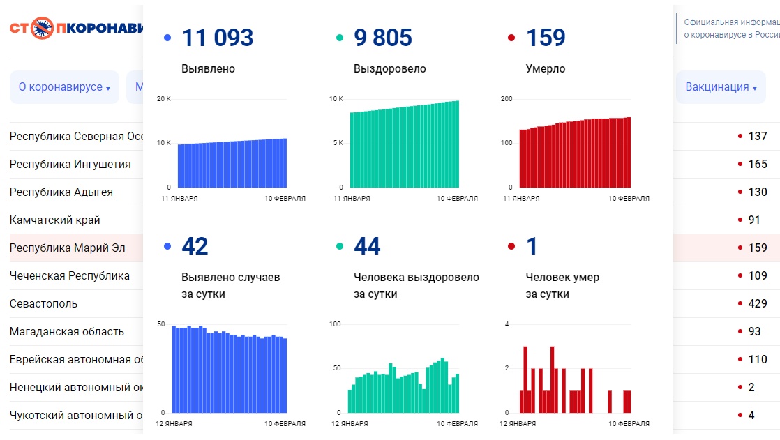Всего с начала пандемии в Марий Эл заболело 11 093 человека, 9 805 человек выздоровело, умерло 159. На сегодняшний день в Марий Эл коронавирусом болеют 1 129 жителей республики.