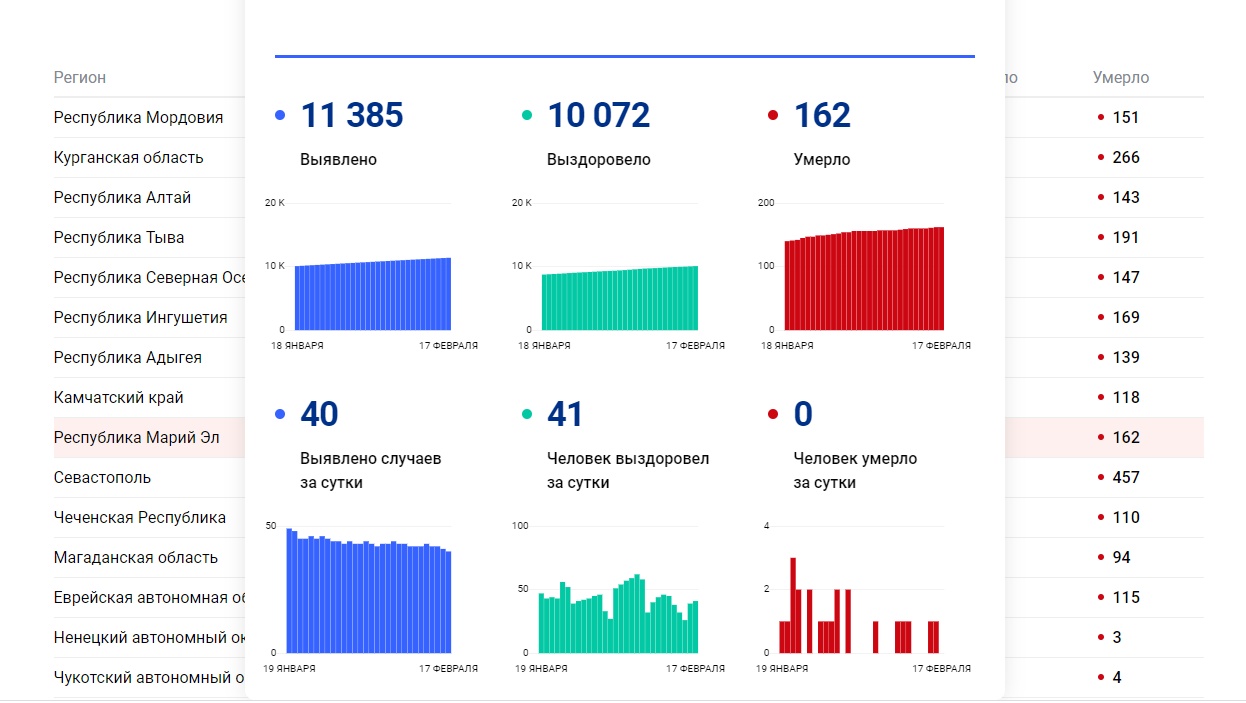 В Марий Эл за прошедшие сутки выявлено 40 новых случаев COVID-19. По информации сайта «стопкоронавирус.рф», сейчас в республике болеет коронавирусом 1 151 человек. Всего с начала пандемии в регионе выявлено 11 385 случаев болезни.