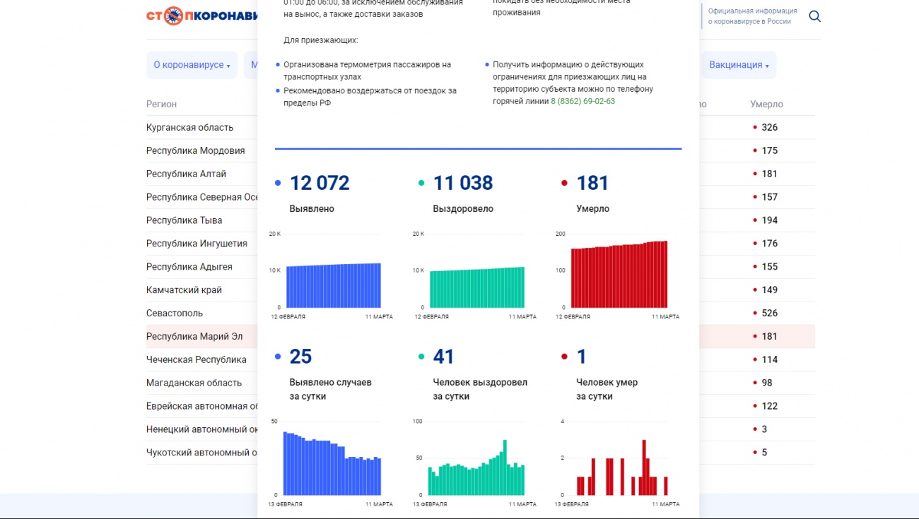 По информации сайта «стопкоронавирус.рф», в России за прошедшие сутки от коронавируса скончались 459 человек. Свою лепту в эту печальную статистку внесла и наша республика — вчера в Марий Эл скончался от болезни еще один человек. Теперь количество умерших от ковида в регионе составляет 181 человек.
