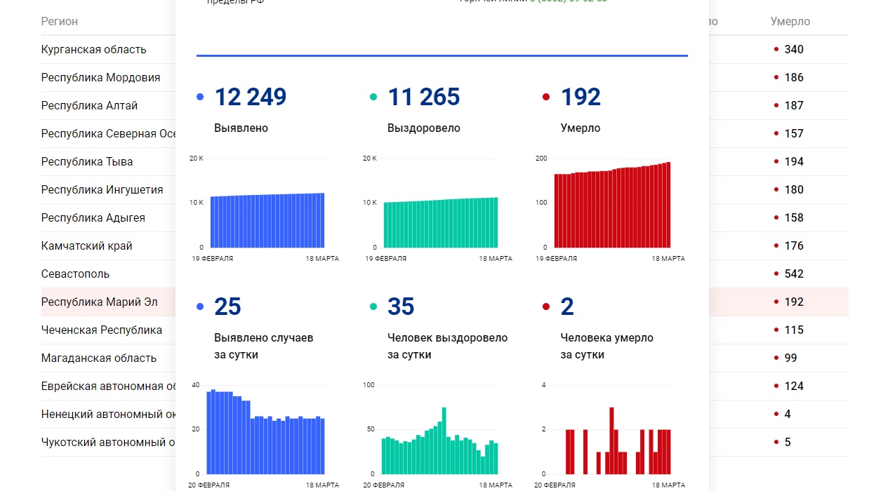 По информации сайта «стопкоронавирус.рф», в республике за прошедшие сутки зафиксировано ещё две смерти от коронавируса. Число жертв достигло 192 человек. За минувший день выявлено 25 новых случаев болезни, выздоровело 35 человек. На сегодняшний день в Марий Эл COVID-19 болеют 792 человека.