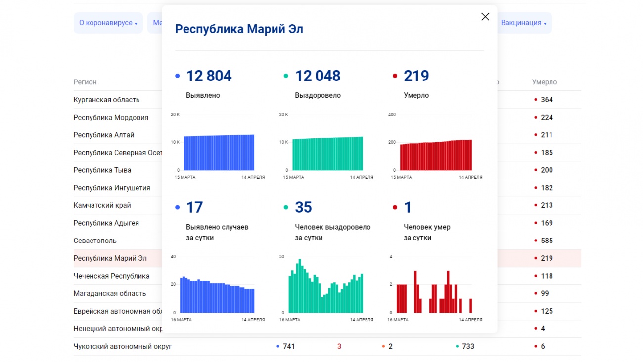 Всего с начала пандемии в Марий Эл заболело 12 804 человека, выздоровело 12 048 человек.