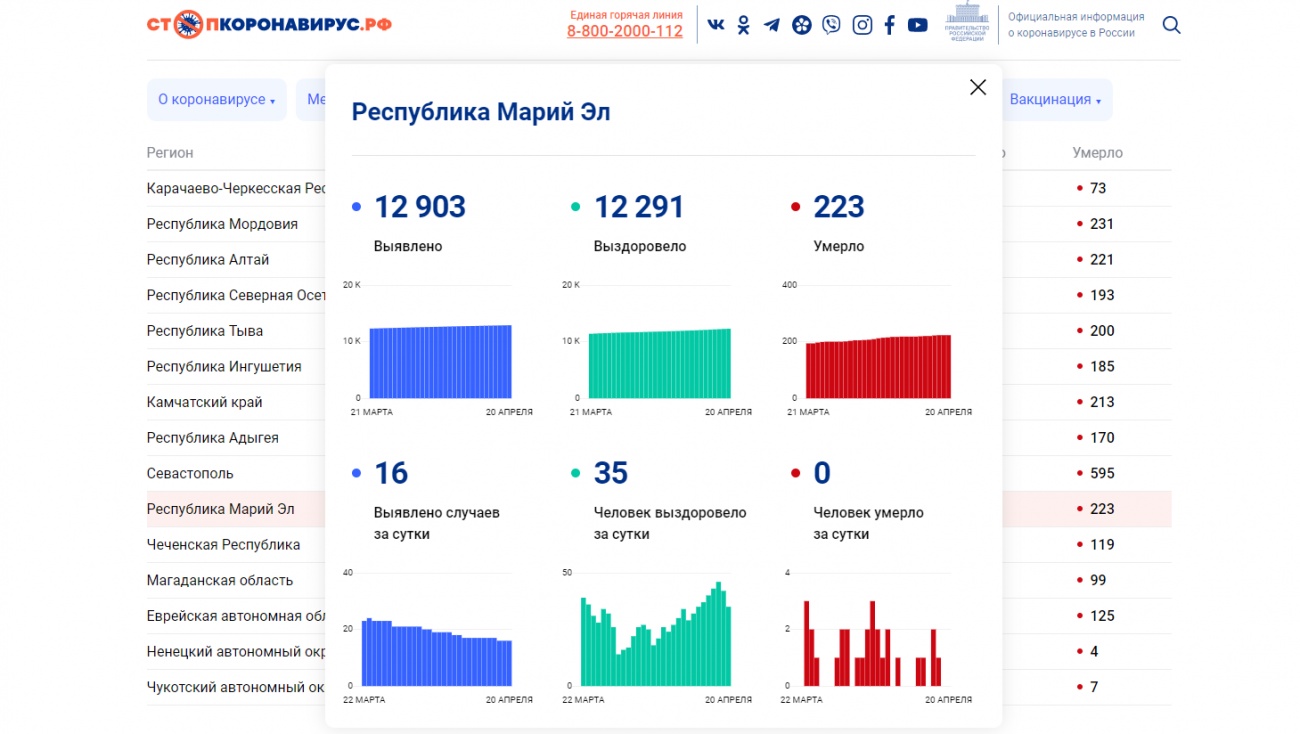 По информации сайта «стопкоронавирус.рф», в Марий Эл за прошедшие сутки зарегистрировано 16 новых случаев COVID-19. Сейчас в республике болеет 389 человек. Всего с начала пандемии в Марий Эл заболело 12 903 человека.