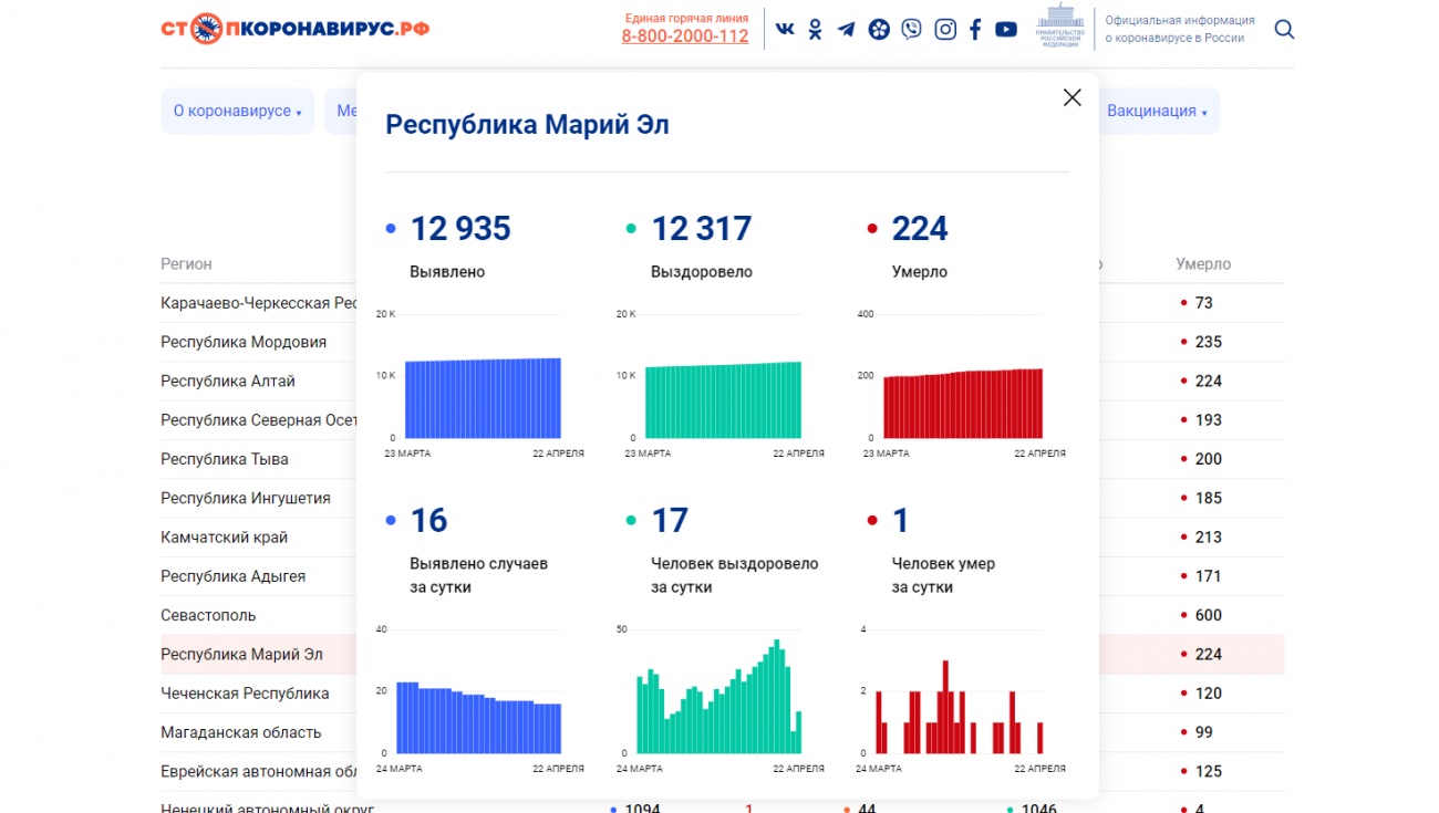 По информации сайта «стопкоронавирус.рф», в Марий Эл за прошедшие сутки выявлено 16 новых случаев COVID-19. Всего с начала пандемии в республике заболело 12 935 человек. Сейчас коронавирусом в регионе болеют 394 человека.