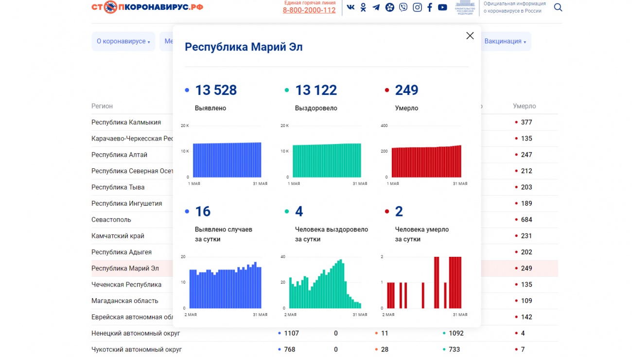 По информации сайта «стопкоронавирус.рф», в воскресенье, 30 мая, в Марий Эл от коронавируса скончались 2 человека. Печальная статистика обновляется в регионе уже пять дней подряд, и число умерших от COVID-19 достигло 249 человек.