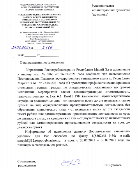 В случае неисполнения Постановления № 1 от 22.07.2021 года главного государственного санитарного врача РМЭ Светланы Булатовой, нарушителей ждёт административное наказание Постановление № 3115 от 29.07.2021 года: