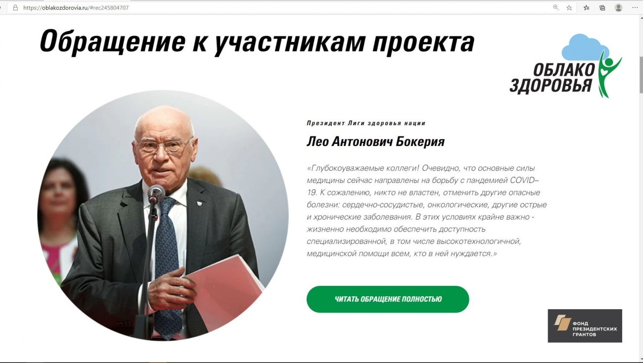 — Очевидно, что основные силы медицины сейчас направлены на борьбу с пандемией COVID-19. К сожалению, никто не властен, отменить другие опасные болезни: сердечно-сосудистые, онкологические, другие острые и хронические заболевания. В этих условиях крайне важно — жизненно необходимо обеспечить доступность специализированной, в том числе высокотехнологичной, медицинской помощи всем, кто в ней нуждается. В проекте принимают участие высокопрофессиональные опытные специалисты. Мы постараемся оказать помощь, всем, кто обратиться за дистанционной консультацией в рамках проекта, — рассказал президент ФГБУ «НМИЦ сердечно-сосудистой хирургии имени А.Н. Бакулева» Министерства здравоохранения РФ, президент Лиги здоровья нации, председатель Комиссии Общественной палаты РФ по охране здоровья граждан и развитию здравоохранения, академик РАН Лео Бокерия.