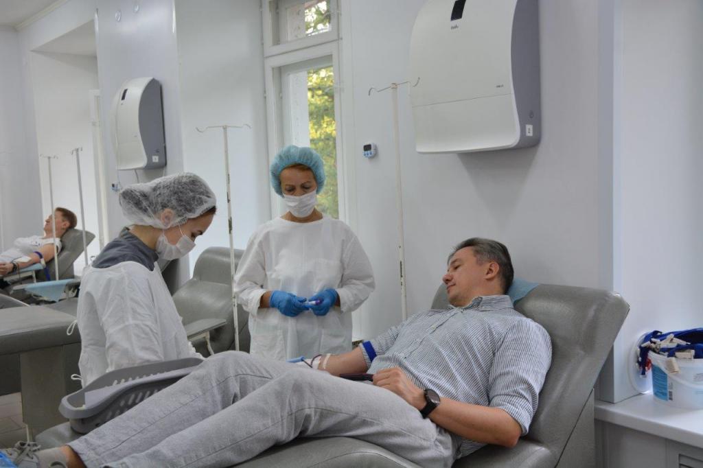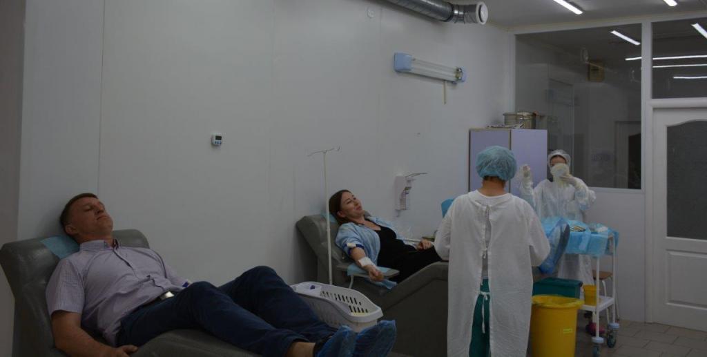 На Республиканской станции переливания крови газовики прошли первичный осмотр, получили от врача необходимый медицинский допуск и выпили по чашке сладкого чая. После чего сдали кровь.