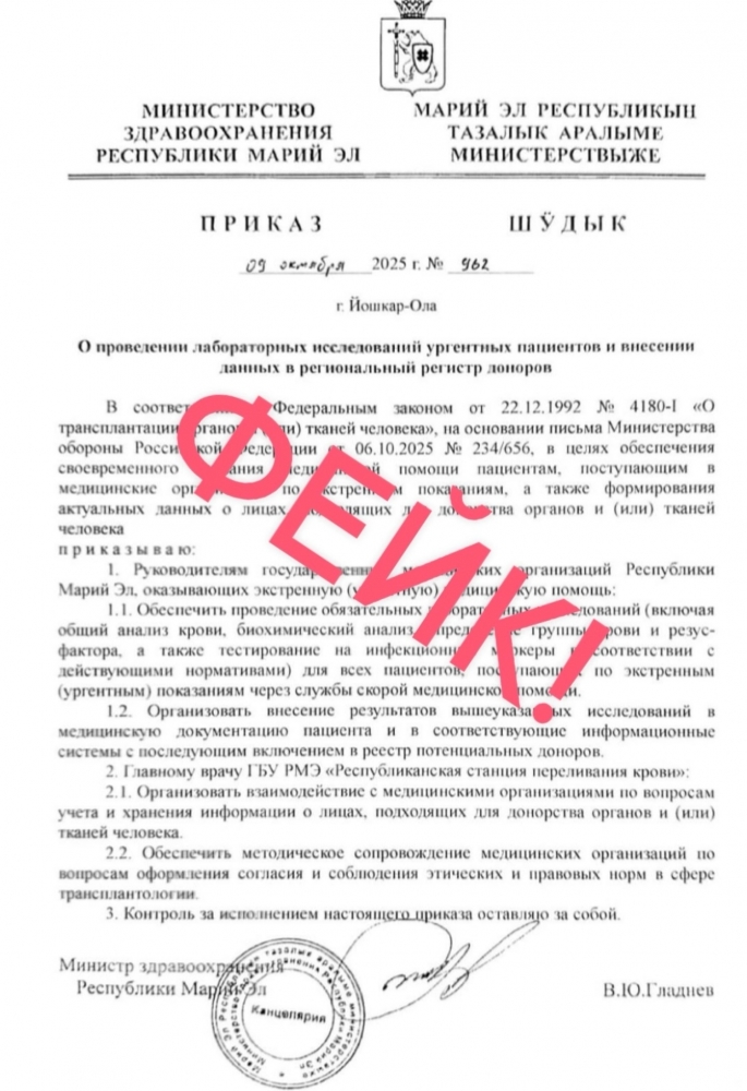 Очередной фейк появился в интернете. Речь идёт о приказе № 962 «О проведении лабораторных исследований ургентных пациентов и внесении данных в региональный регистр доноров» за подписью Владимира Гладнева.