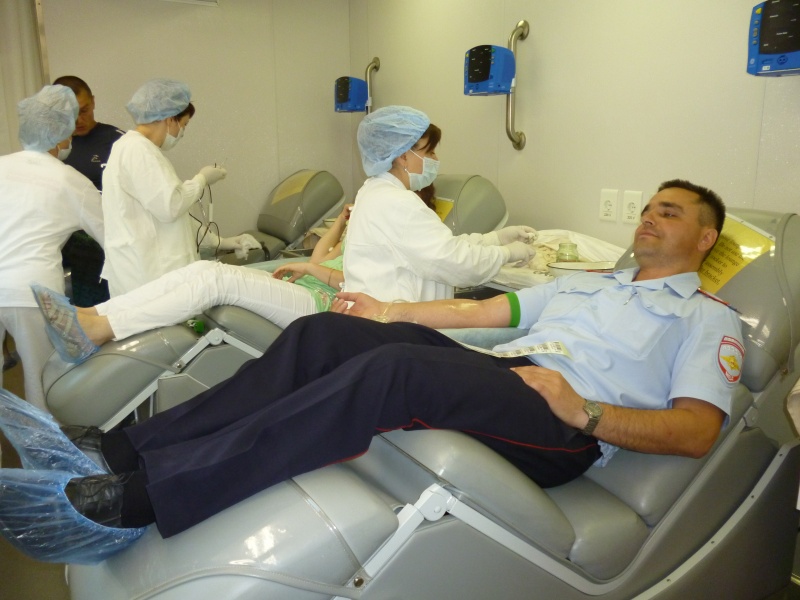 На базе Управления прошел выездной «День донора». В гости к полицейским приехал мобильный пункт заготовки крови. Такая передвижная станция располагает всем необходимым для забора крови, транспортировки и хранения 700 литров крови. За день мобильный пункт заготовки крови может принять до 120 доноров. Процедура донации в мобильном пункте ничем не отличается от традиционной: сдача экспресс-анализа, посещение врача-терапевта, чаепитие и сама донация. Несмотря на то, что процедура для одного человека занимает несколько минут, у автобуса выстроилась очередь доноров в погонах.