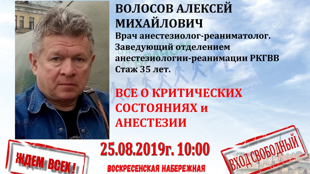 «Час ходьбы с врачом» продолжается. В воскресенье, 25 августа, состоится ставшая уже традиционной встреча. На это раз все желающие смогут поговорить с анестезиологом-реаниматологом Алексеем Михайловичем Волосовым. Он заведует отделением анестезиологии-реанимации республиканского клинического госпиталя ветеранов войн и имеет стаж работы 35 лет.