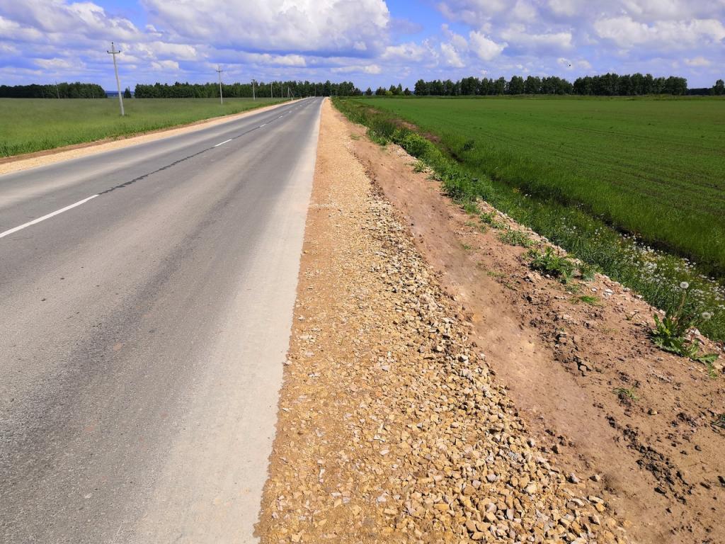 В 2020 году в рамках содержания автомобильных дорог выполнены работы по укреплению обочин щебнем и планировка грунтовой части обочин. Запланированный объём работ выполнен полностью.