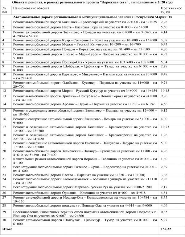 На дорогах регионального значения за два года реализации нацпроекта отремонтированы главные артерии Марий Эл, которые обеспечивают межрегиональные и межмуниципальные связи. В Йошкар-Олинской городской агломерации обеспечена транспортная доступность к туристическим, социально-значимым объектам и медицинским учреждениям. Доля автомобильных дорог, находящихся в нормативном состоянии увеличилась с 1,19% до 10,7%, что составило 306 км автомобильных дорог общего пользования регионального значения из 3047,1 км.
