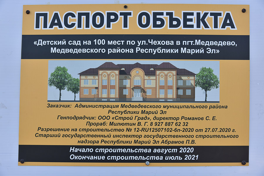Детский сад на 100 мест возводится и в новом микрорайоне в посёлке Медведево. На строительство и оснащение объекта в рамках национального проекта предусмотрено почти 93 млн рублей. Готовность объекта составляет 71%. Завершить строительство планируется до августа текущего года, проводятся конкурсные процедуры на поставку мебели и оборудования.