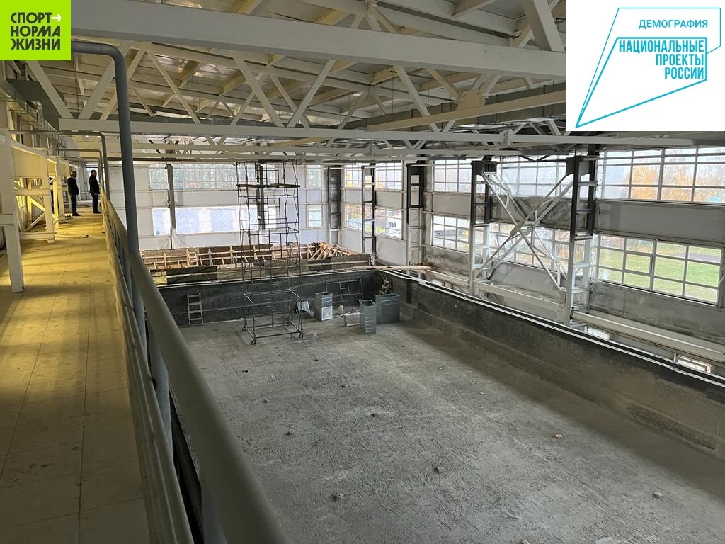 На данный момент завершена заливка большой чаши бассейна бетоном. Подрядчики устанавливают окна и двери, прокладывают внутренние сети отопления, канализации, водоснабжения. Также ведутся работы по устройству входной группы, опалубки под заливку днища малой чаши бассейна, монтируются подвесные потолки, на проезде кладут бордюрный камень.