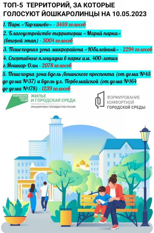 На сегодняшний день уже определилась пятёрка лидеров, за которые горожане активно отдают свои голоса. Это парк «Тарханово», второй этап «Марий парка», пешеходная зона микрорайона «Юбилейный», спортплощадки им. 400-летия Йошкар-Олы, пешеходная зона вдоль Ленинского проспекта и вдоль улицы Первомайской.