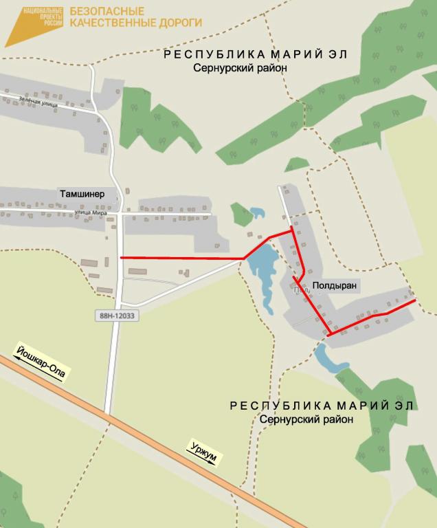- автомобильной дороги «Тамшинер — Полдыран». Протяженность дороги составит 1,6 км. Общая стоимость работ — 85,1 млн рублей. Главной целью строительства является обеспечение автотранспортной связи с деревней Полдыран, что позволит значительно повысить уровень жизни жителей данного населённого пункта и обеспечит доступ к образовательным учреждениям;