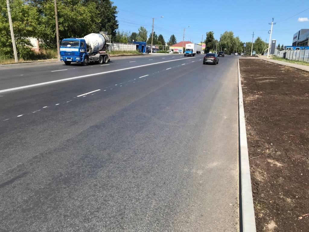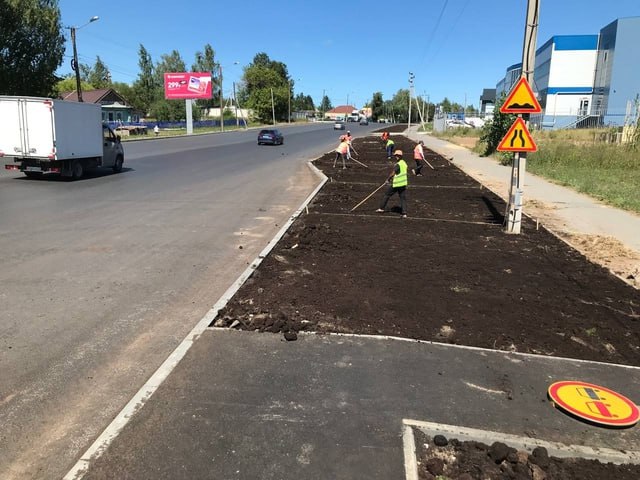 Сейчас подрядная организация завершает обустройство газона с посевом трав. Дорожники наносят горизонтальную разметку, которая поможет водителям и пешеходам ориентироваться на дороге.