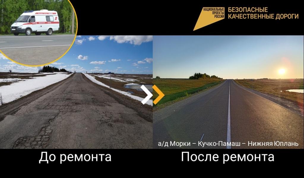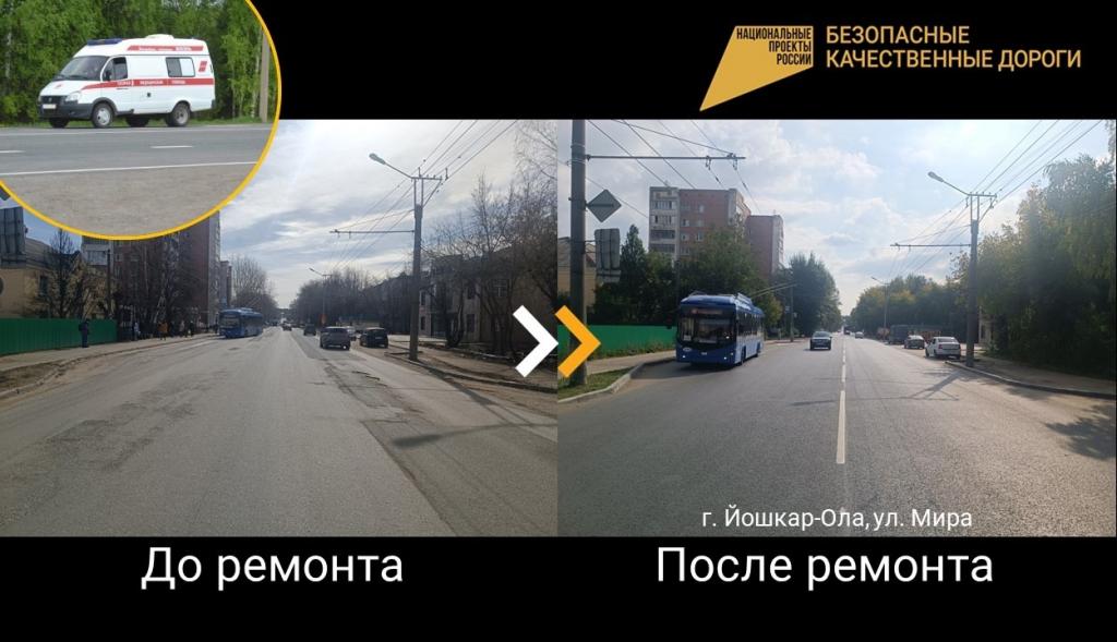 Также на всех дорогах, запланированных к ремонту в этом году и ведущих к медицинским учреждениям, уложено асфальтобетонное покрытие в полном объёме. Всего обновлено 15 участков, по которым ездят к пунктам здравоохранения, общей протяжённостью порядка 100 км. В этом году маршруты были отремонтированы в семи районах, а также в Йошкар-Оле.