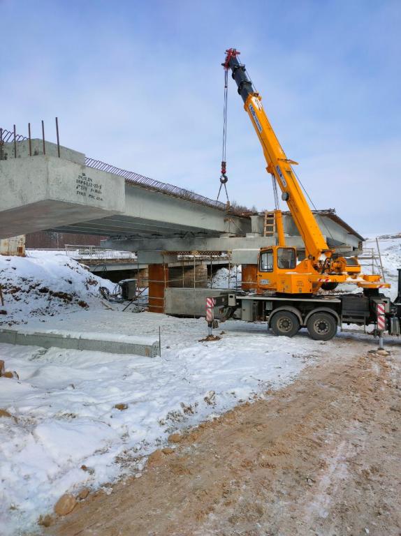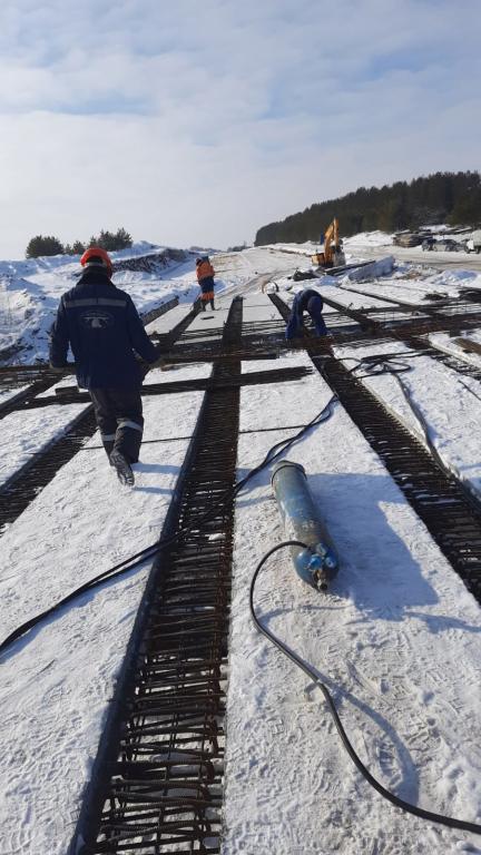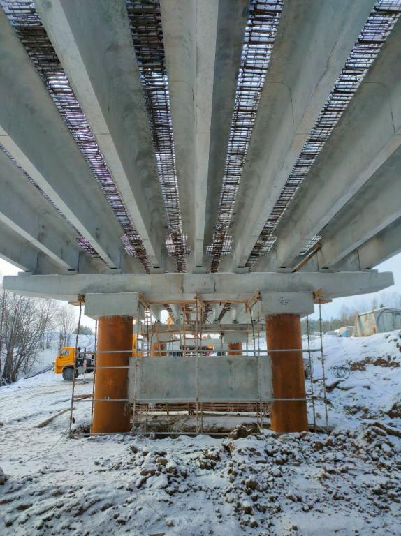 Несмотря на морозную погоду, подрядная организация полностью завершила монтаж балок пролётного строения.