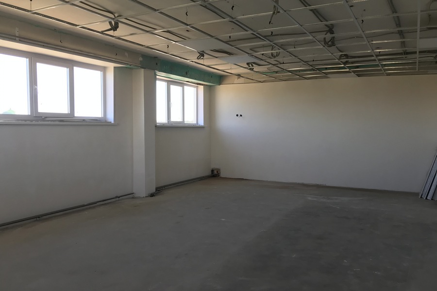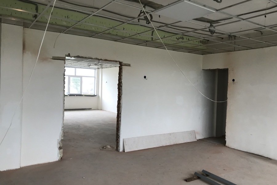 В детском саду «Орлёнок» активно продолжается обновление системы водоснабжения и водоотведения. Старые трубы отопления уже демонтированы. На первом этаже идёт замена электропроводки и выравнивание стен. На втором этаже продолжается отделка стен, укладка плитки на пол и в санузлах, а также в буфетных. Специалисты продолжают установку системы вентиляции и работы с фасадом. По состоянию на текущий момент выполнено 46% всех запланированных работ.