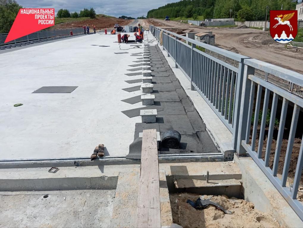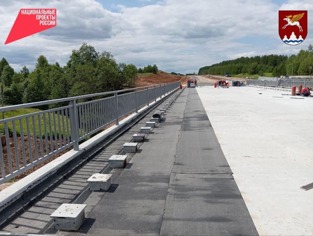 Подрядная организация после затирки и шлифовки верхнего слоя бетона укладывает гидроизоляцию. Также на объекте обустраивают щебёночный подстилающий слой, а со стороны Йошкар-Олы уложили выравнивающий слой асфальтобетонного покрытия.