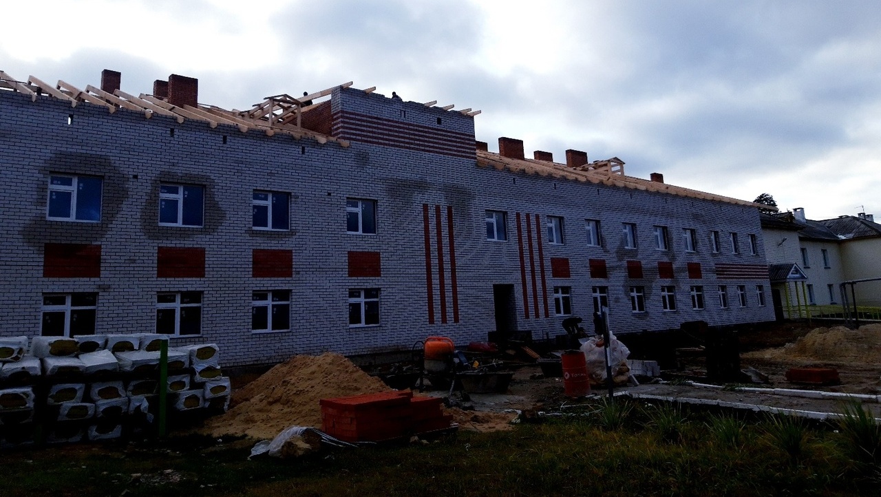 По состоянию на 22 октября выполнены работы по устройству фундаментов, кирпичная кладка наружных стен и внутренних перегородок, монтаж межэтажных перекрытий, заполнений оконных проемов, смонтирован канализационный трубопровод в полах первого этажа. Идут работы по монтажу сетей электроснабжения, штукатурке стен, устройству стропильной системы и покрытия кровли.