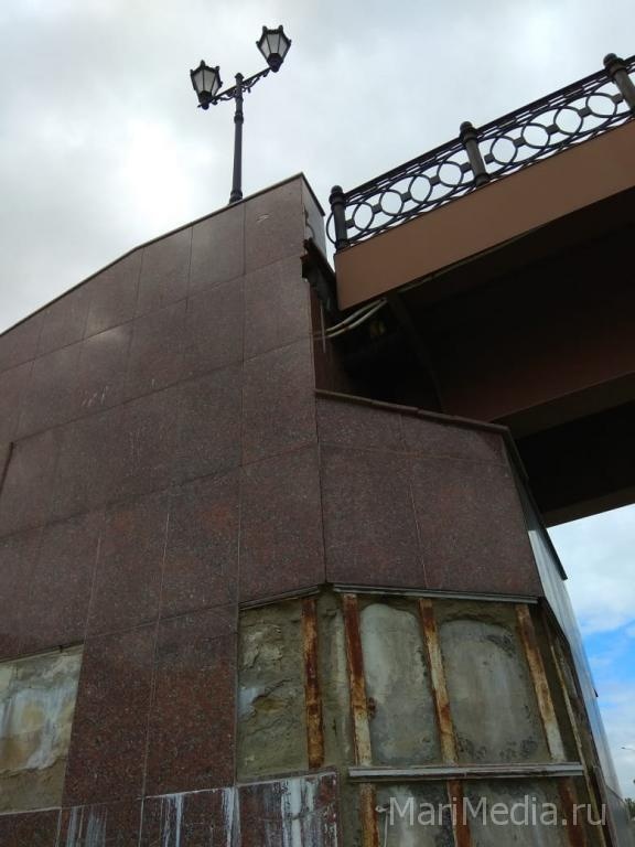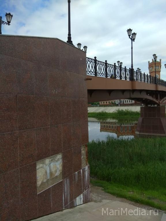В редакцию ИА МариМедиа поступили фотоматериалы, которые наглядно демонстрируют нынешний внешний облик двух пешеходных мостов: Гоголевского и Воскресенского. По словам очевидцев, приславших фотографии, уже отвалилось огромное количество декоративных плит, а металлические крепления разъедает ржавчина.