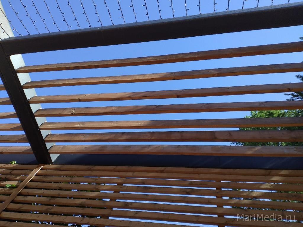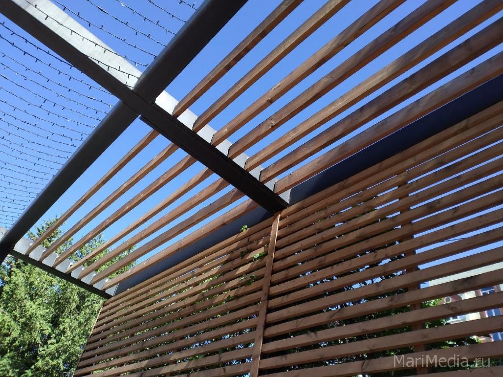 Во время дождя летние конструкции бесполезны, они не спасают горожан от природной стихии. Крыши достаточно оборудовать только над скамейками, чтобы не портить эстетический вид натяжной иллюминации.