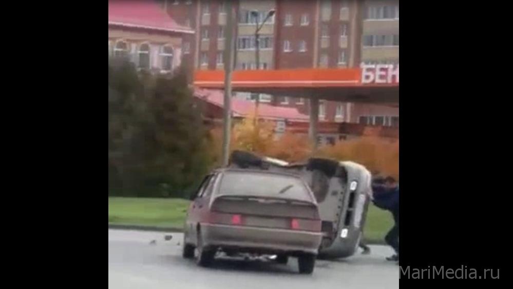 В Йошкар-Оле около заправки на Воскресенском проспекте произошло ДТП. В результате столкновения двух машин, одно транспортное средство перевернулось на дороге.