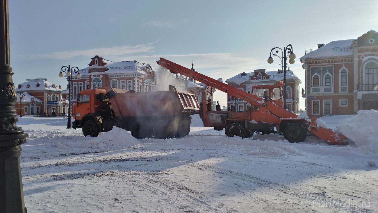 1. На площади Девы Марии работает снегоуборочная техника. Горы снега, скопившиеся на площади, вывозят «КамАЗами» на снежную свалку.