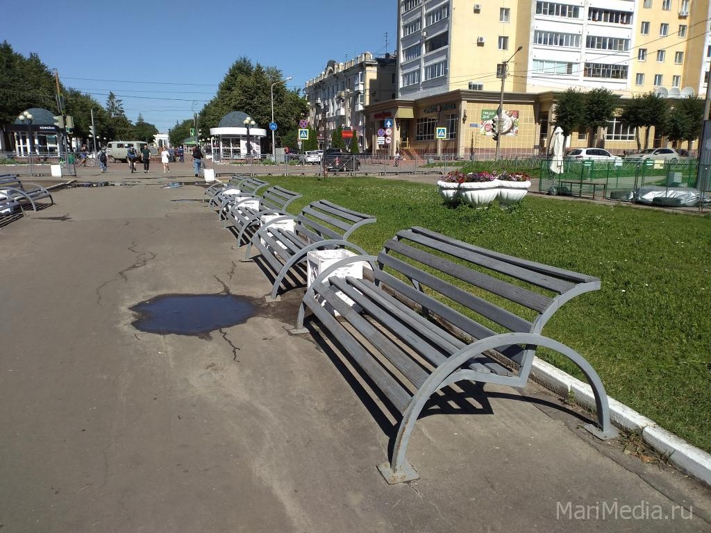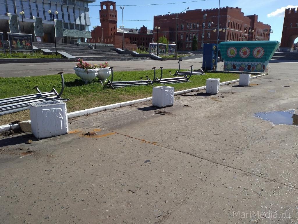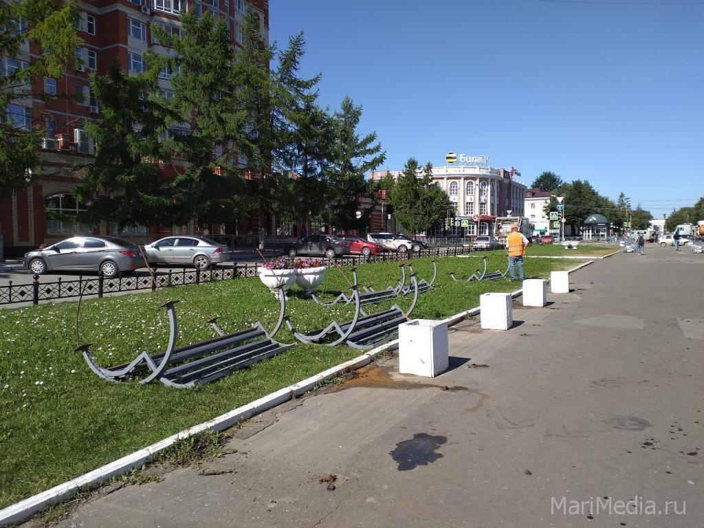 Сегодня жители Йошкар-Олы стали свидетелями законного вандализма. Сотрудники МУП «Город» с помощью трактора вырывали из асфальта на бульваре Чавайна лавки.