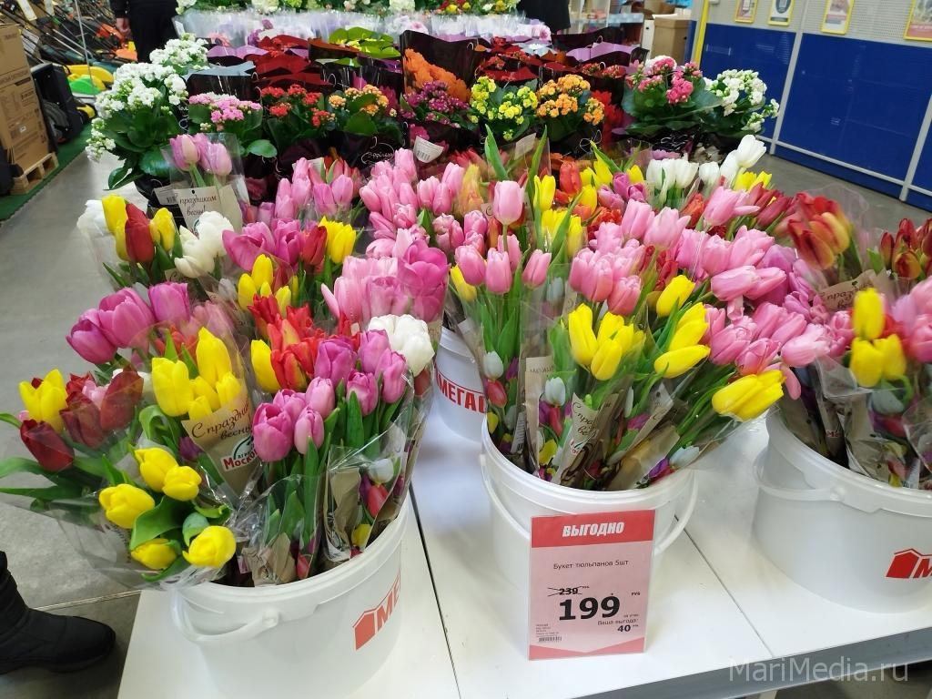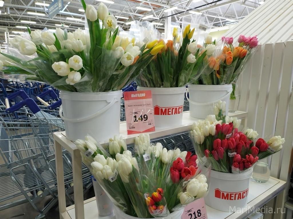 Огромные площади под живые цветы заняты в торговых центрах. Стоимость букетов из 3, 5 и 7 тюльпанов колеблется от 149 рублей до 495 рублей.