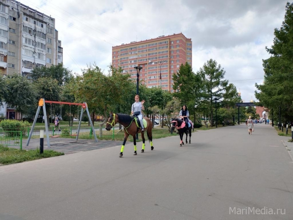 2. По бульвару Чавайна по пешеходной зоне гарцуют юные наездницы. Йошкаролинцы с интересом рассматривают грациозных барышень на скакунах.
