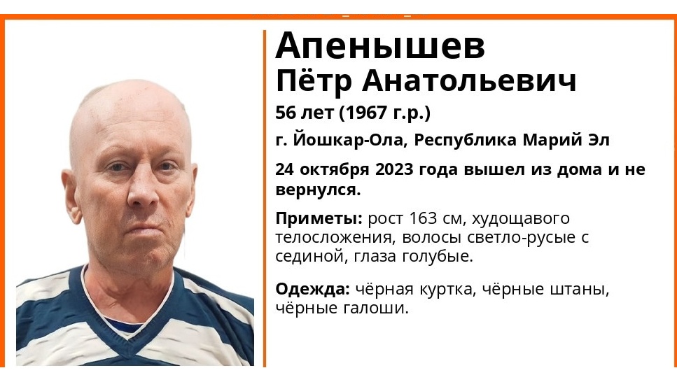В Йошкар-Оле ищут 56-летнего Петра Анатольевича Апенышева. Мужчина пропал 24 октября. Вышел из дома и не вернулся.