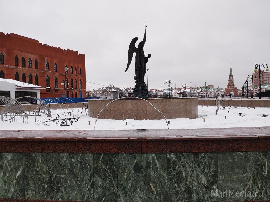 Сегодня начался монтаж светового оборудования фонтана Архангела Гавриила на площади Пресвятой Девы Марии в Йошкар-Оле.